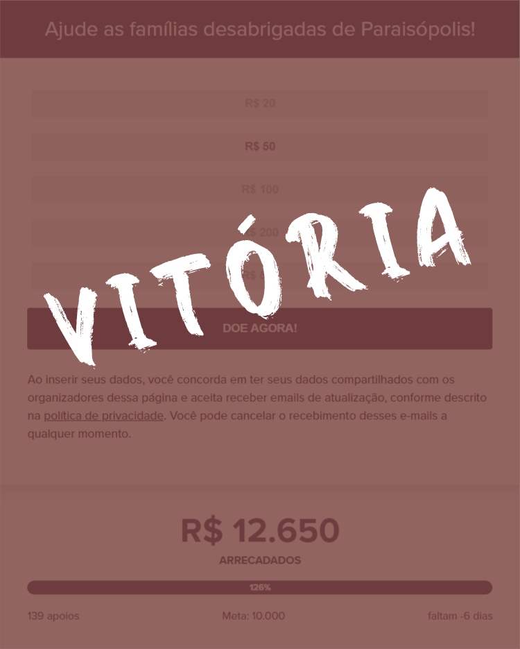 Diante da negligência da Prefeitura de São Paulo, que ofereceu apenas um valor irrisório e temporário de R$400 por mês para as famílias que estavam desabrigadas, a Minha Sampa se articulou com as moradoras que foram atingidas, e lançamos o Financiamento Coletivo #ParaisópolisResiste para ajudar as famílias a terem uma oportunidade de reconstruírem suas vidas.